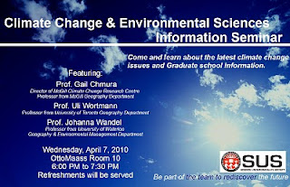 Climate Change & Environmental Sciences Information Seminar: Wednesday, April 7, 2010 from 6:00 PM to 7:30 PM at OttoMaass Room 10. Refreshments will be served.